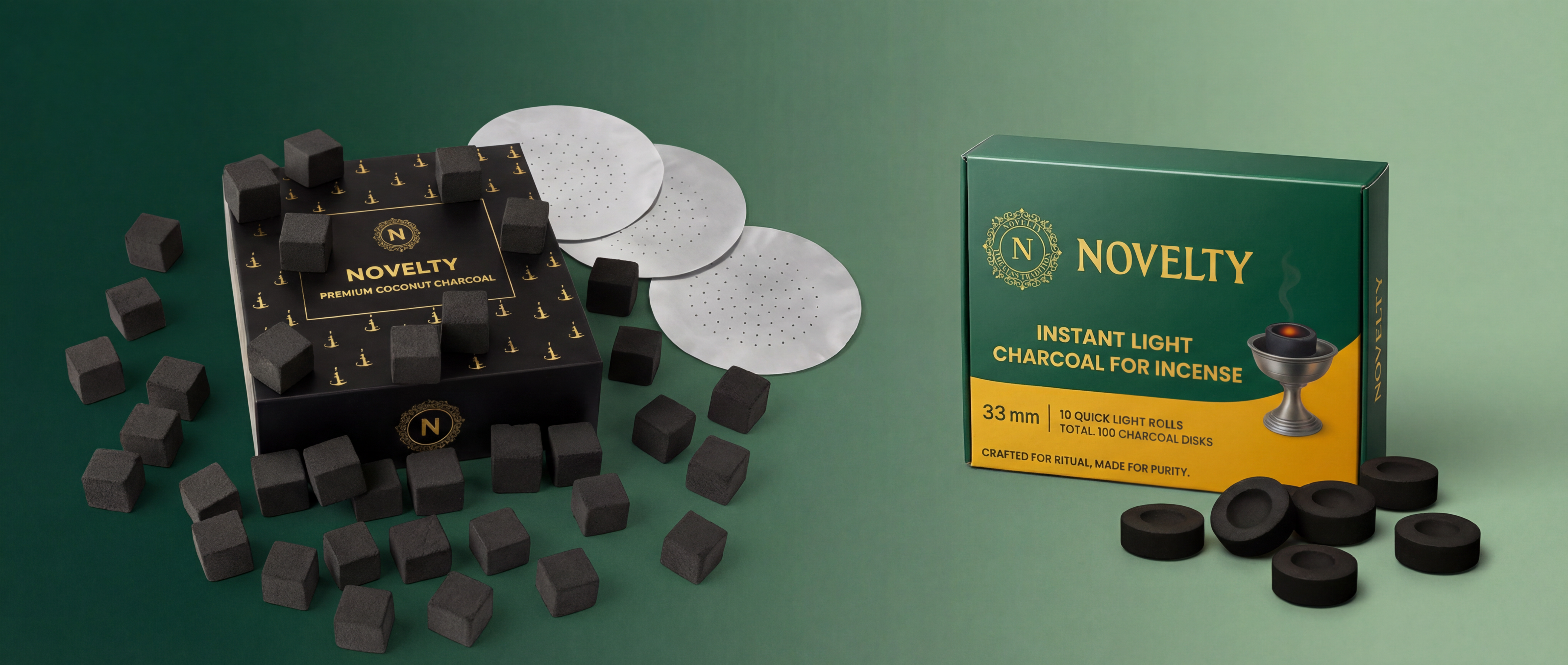 One element. Two rituals. Novelty Charcoal is premium coconut charcoal crafted for incense burners and hookah enthusiasts alike.